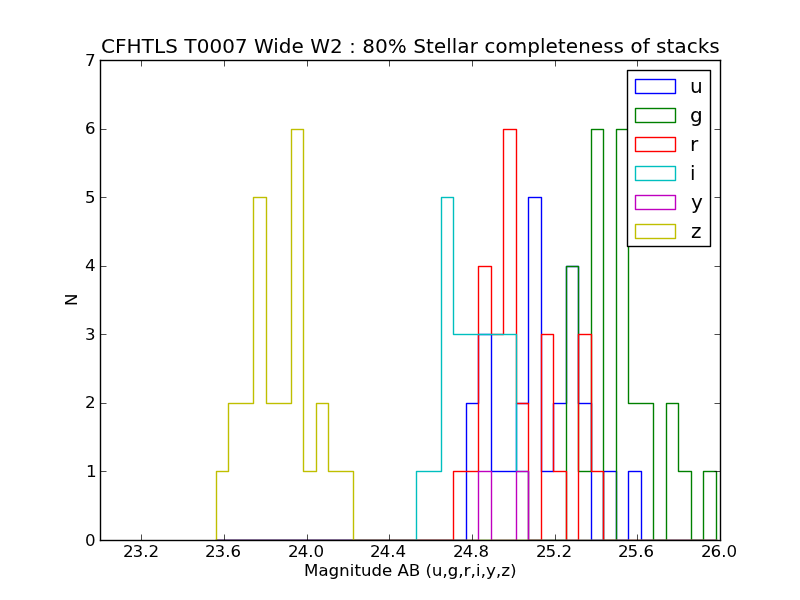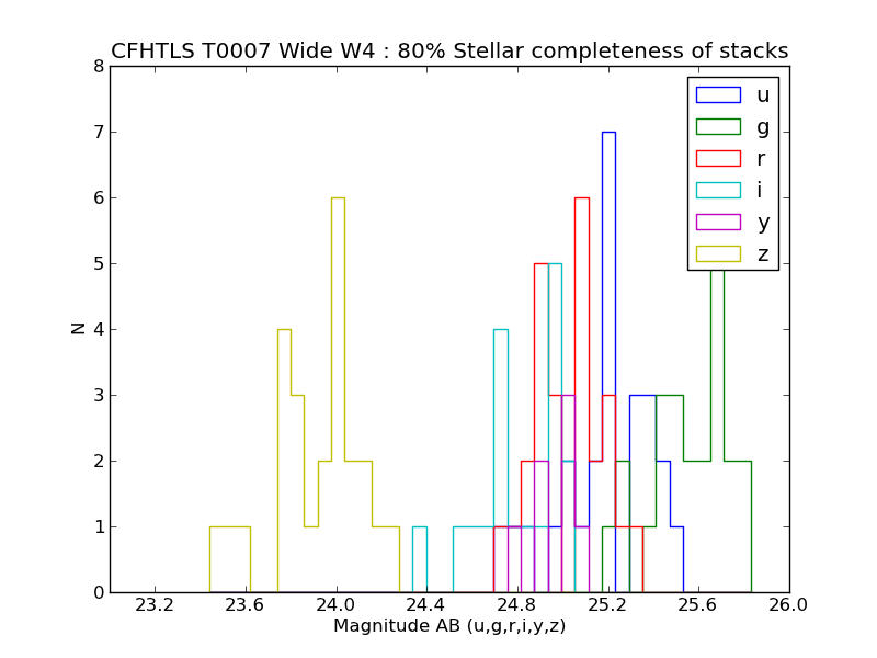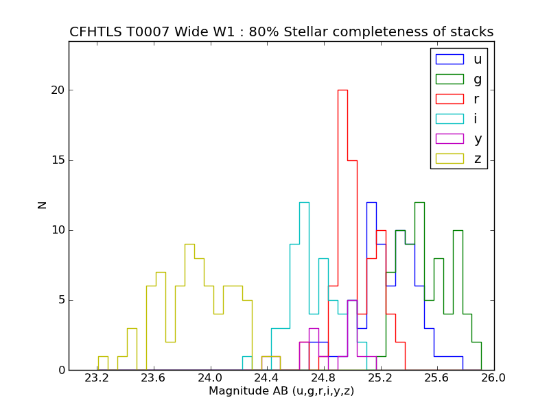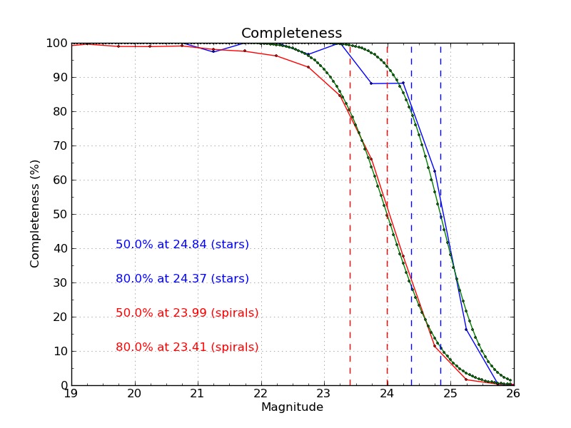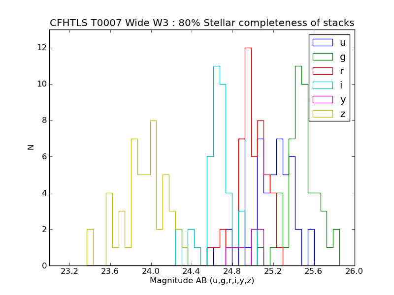 The completeness limit is then derived from the averaged completeness value over the central 10000×10000 MegaCam fields. The statistics are computed in each field separately and for each filter. The output is the fraction of sources detected and measured as a function of magnitude. The magnitudes at 80% and 50% completeness are given for point-like (star or bulge) and for extended (disks) sources.