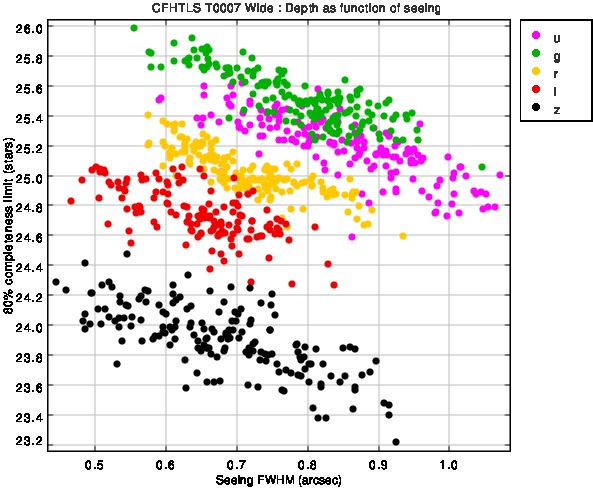 The sources are then convolved by a PSF that takes into account the pupil of the CFHT telescope (mirrors and arms) and other components of the PSF. The PSF is built by using the diffraction and the simplest aberration components of the CFHT telescope, as well as the typical atmospheric contributions that degrade long exposures. A set of simulations are produced with PSF FWHM ranging from 0.4′′ to 1.3′′. For each stack, the simulated images with the closest PSF in FWHM size is then used to compute the final completeness. This “adaptive FWHM” method gives rise to larger dispersion in the completeness distribution compared to T0006. The T0007 completeness encompass both the exposure time and depth effect, as well as the image quality. The point source completeness is therefore more affected than the extended objects one.
